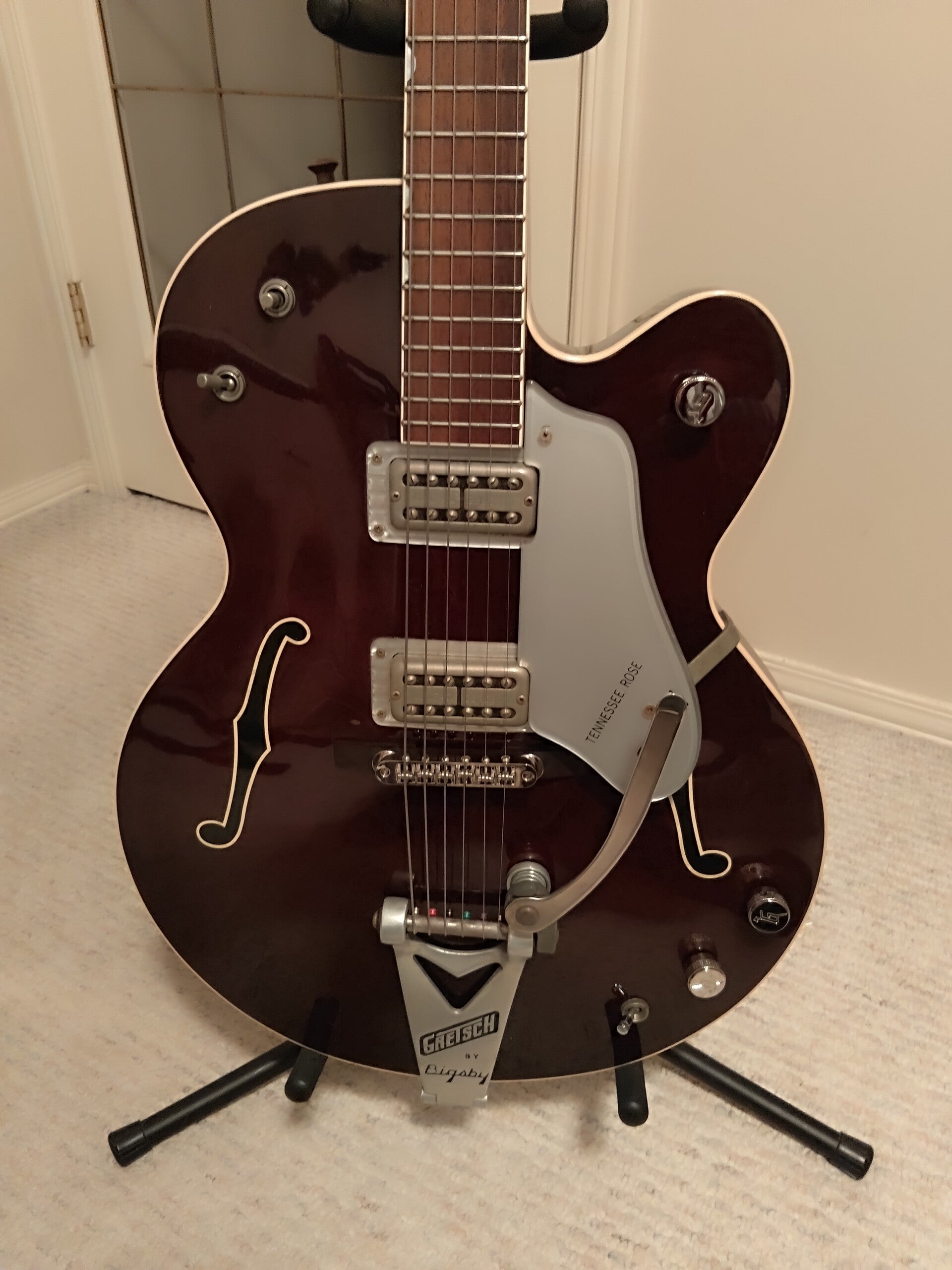 This Gretsch G6119 Tennessee Rose is a Fantastic Hollowbody and a terrific nod to a classic. A high-quality '62 reissue ca. 2000, this beautiful guitar is an essential instrument dripping with George Harrison vibes. The neck is arrow straight with low n' quick action and the electronics are functioning as they should. The dual Filtertron pickups deliver outstanding tone with ever-expanding playing options from the Bigsby trem system. A pleasure to play.